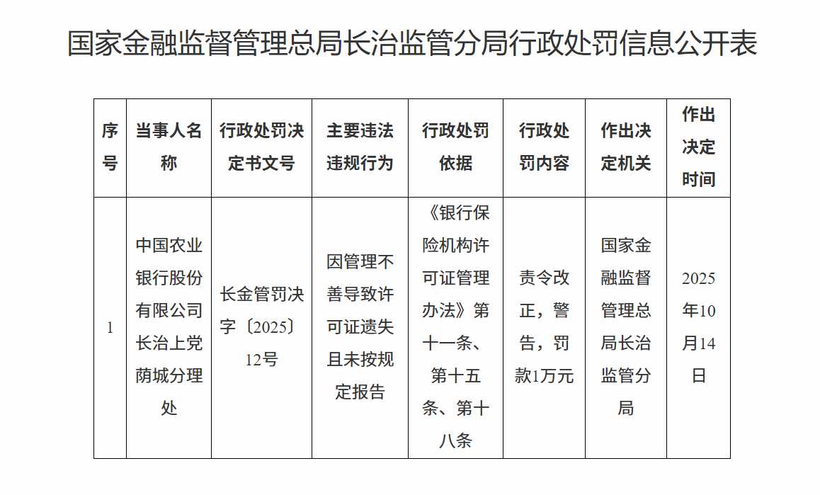 10月21日,国家金融监督管理总局长治监管分局行政处罚信息公开表显示,中国农业银行股份有限公司长治上党荫城分理处因因管理不善导致许可证遗失且未按规定报告被责令改正,警告,罚款1万元。